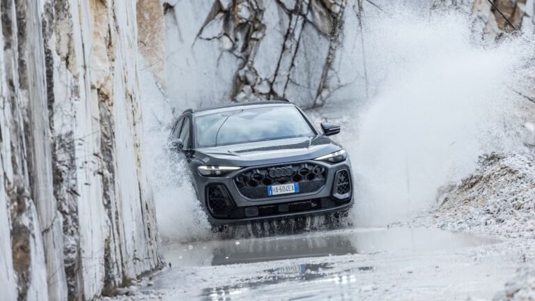 Si mette in posa in una scenografia lunare, tra pareti che sembrano quinte teatrali abbaglianti, dove la raffigurazione in versione arte di strada della Creazione di Adamo che OZMO ha reinterpretato, rende omaggio a Michelangelo, quasi a voler creare un filo (diamantato come quello che aiuta a tagliare i blocchi di marmo), tra storia millenaria e tecnologia pura. Qui Audi Q 5 e-hybrid con le sue forme scolpite parla lo stesso linguaggio stilistico della scultura rinascimentale: sottrazione, purezza, tensione delle forme, con le nervature della carrozzeria che catturano e disegnano traiettorie di luce e gruppi ottici a LED che tracciano segni luminosi netti, precisi, come le incisioni su blocchi di marmo. All’interno è la tecnologia a modellare il movimento. Non soltanto materiali soft-touch rendono le superfici levigate come il marmo, ma un avvolgente palcoscenico digitale domina la plancia e prosegue con un altro display dal lato passeggero, con l’intelligenza artificiale applicata al controllo vocale e il sistema operativo Android Automotive OS.