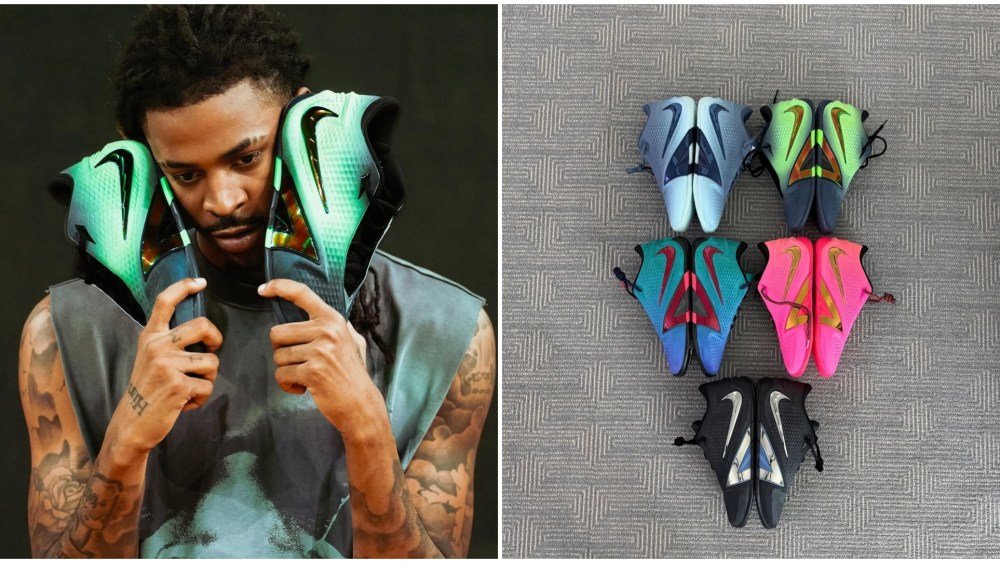 Cinque stili diversi sono stati inclusi nel post di Morant e mentre le trame specifiche dietro le colorazioni in arrivo rimangono nascoste, i look offrono uno sguardo al prossimo capitolo della sua linea caratteristica. Le coppie nel teaser includono un trucco nero e cromato che ricorda le precedenti collaborazioni di Morant con Swarovski, uno stile rosa con accenti dorati metallici, uno stile con una sfumatura sfumata dal blu all’ottanio accentuata dal rosso metallizzato, una sfumatura dal nero al verde e un trucco in scala di grigi.
